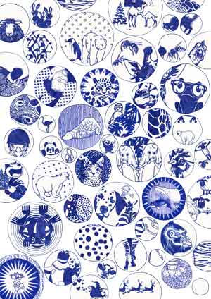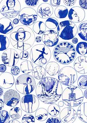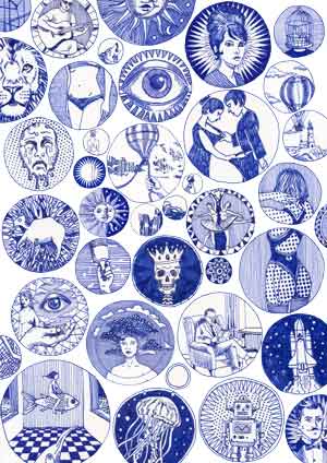 [De] – Diese Serie besteht nun aus blauen Federzeichnungen im A4-Format, die eingescannt und auf hochwertigem, mit dem Original identischem Papier in einer Auflage von 100 Exemplaren gedruckt wurden, die alle nummeriert, signiert und katalogisiert wurden (abzüglich eines Exemplars für das Archiv des Künstlers). Gelegentlich schleichen sich Varianten ein, die einige Drucke originell und einzigartig machen.