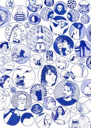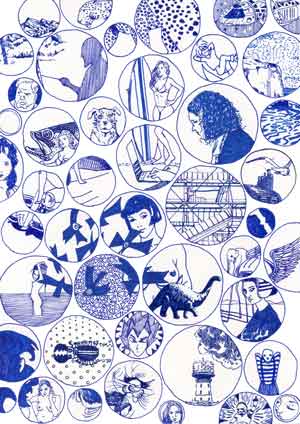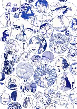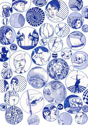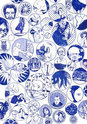 [En] – This series now consists of A4-drawings, executed in blue pen, which were then scanned and printed on high quality paper identical to the original paper (100 copies), all numbered, signed and catalogued (except for one copy kept for the artist’s archives). Sometimes varieties slip through and make some prints original and unique.